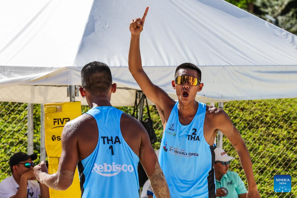Surin Jongklang/Kittituch Khomkham (R) of Thailand celebrate scoring during the men's pool A match between D'Artagnan Potts/Jack Pearse of Australia and Surin Jongklang/Kittituch Khomkham of Thailand at the AVC Beach Volleyball Tour 2nd Nuvali Open in Laguna Province, the Philippines, April 3, 2025. (Xinhua/Rouelle Umali)