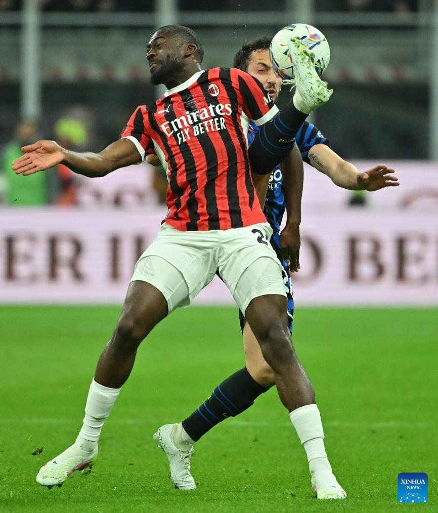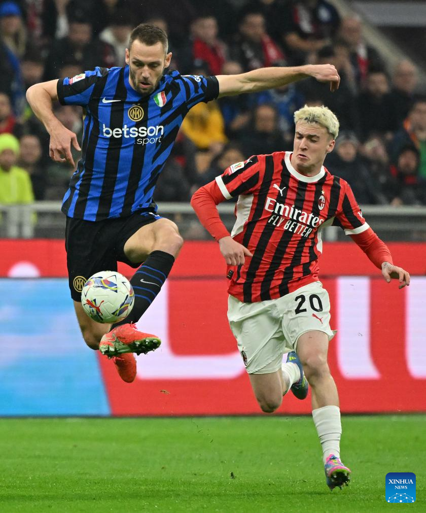 AC Milan's Alex Jimenez (R) vies with Inter Milan's Stefan De Vrij during the Italian Cup semifinal first leg match between AC Milan and Inter Milan in Milan, Italy, April. 2, 2025. (Photo by Alberto Lingria/Xinhua)