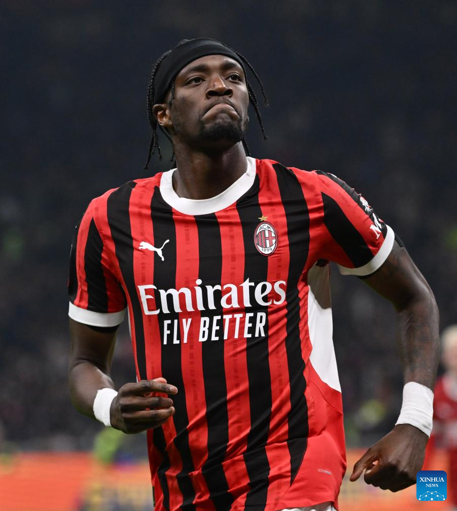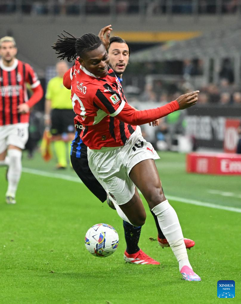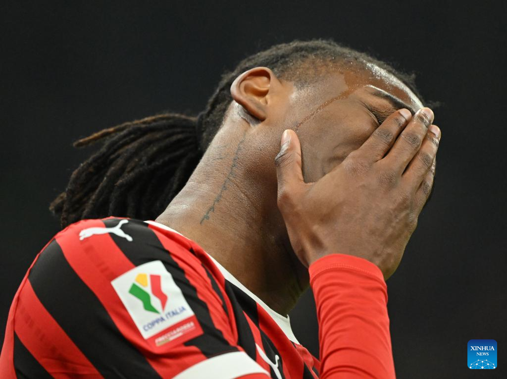 AC Milan's Rafael Leao reacts during the Italian Cup semifinal first leg match between AC Milan and Inter Milan in Milan, Italy, April. 2, 2025. (Photo by Alberto Lingria/Xinhua)