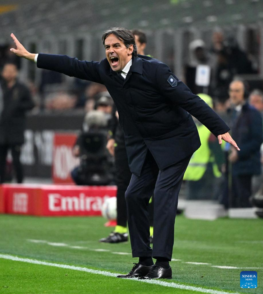 Inter Milan's head coach Simone Inzaghi gestures the Italian Cup semifinal first leg match between AC Milan and Inter Milan in Milan, Italy, April. 2, 2025. (Photo by Alberto Lingria/Xinhua)