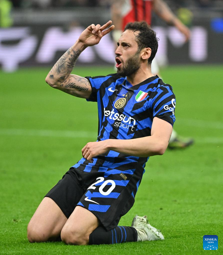 Inter Milan's Hakan Calhanoglu celebrates his goal during the Italian Cup semifinal first leg match between AC Milan and Inter Milan in Milan, Italy, April. 2, 2025. (Photo by Alberto Lingria/Xinhua)