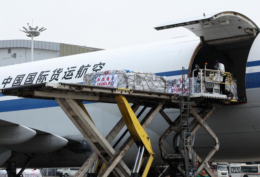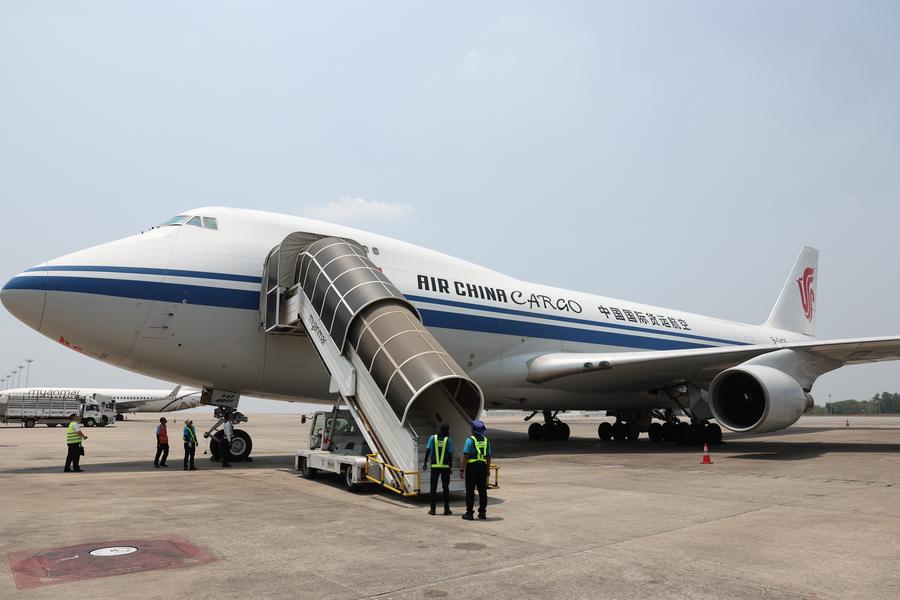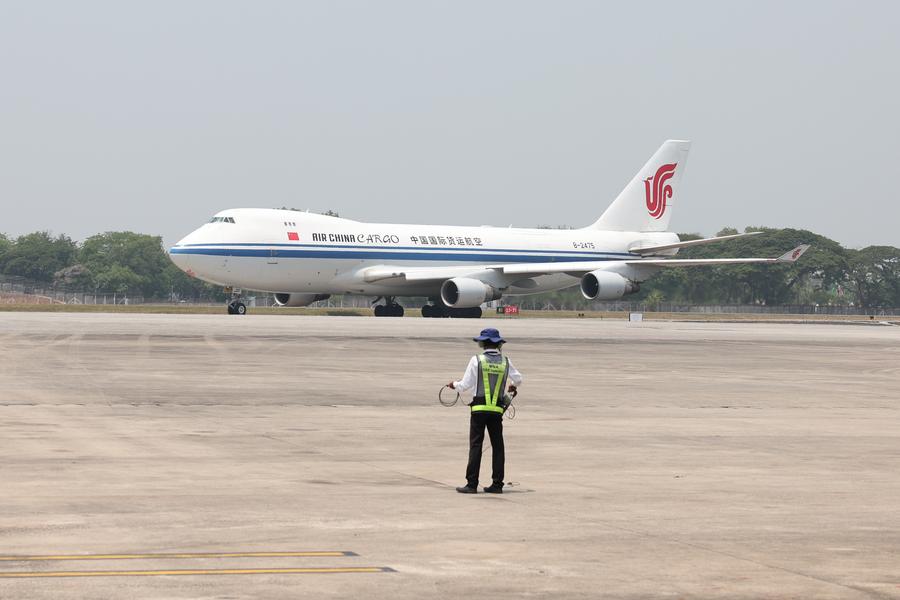 The second batch of emergency humanitarian aid supplies for earthquake disaster relief dispatched by the Chinese government arrives at Yangon International Airport in Yangon, Myanmar, April 3, 2025. (Xinhua/Jia Haocheng)