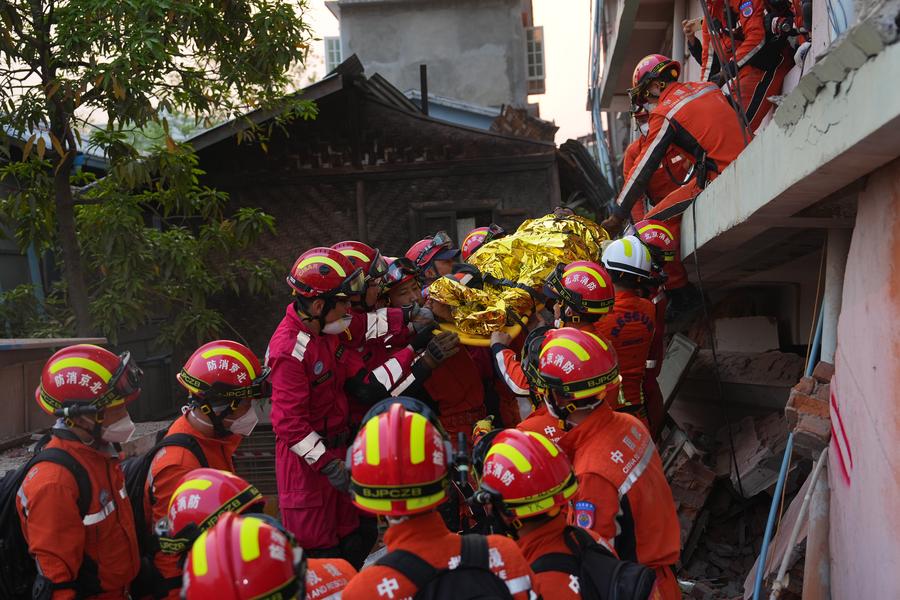 YANGON, April 3 (Xinhua) -- The Chinese rescue team successfully extricated a male survivor at a hotel on Wednesday afternoon in Mandalay, Myanmar.