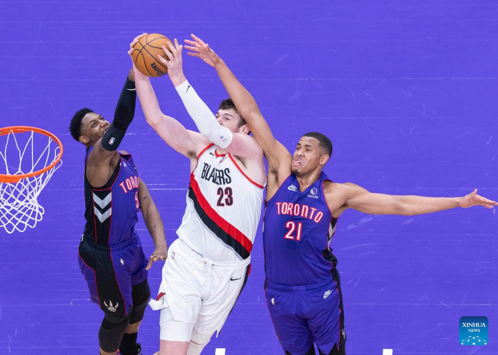 Orlando Robinson (R) and RJ Barrett (L) of Toronto Raptors fight for a rebound with Donovan Clingan of Portland Trail Blazers during the 2024-2025 NBA regular season game between Toronto Raptors and Portland Trail Blazers in Toronto, Canada, on April 3, 2025. (Photo by Zou Zheng/Xinhua)