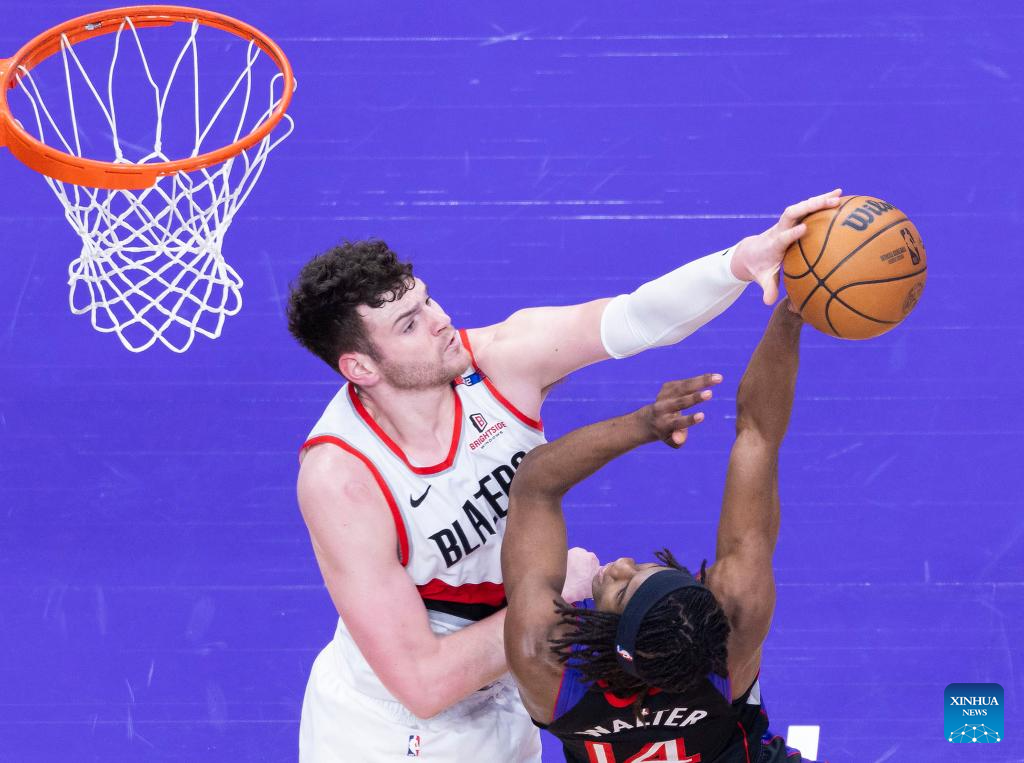 Donovan Clingan (L) of Portland Trail Blazers blocks Ja'Kobe Walter of Toronto Raptors during the 2024-2025 NBA regular season game between Toronto Raptors and Portland Trail Blazers in Toronto, Canada, on April 3, 2025. (Photo by Zou Zheng/Xinhua)