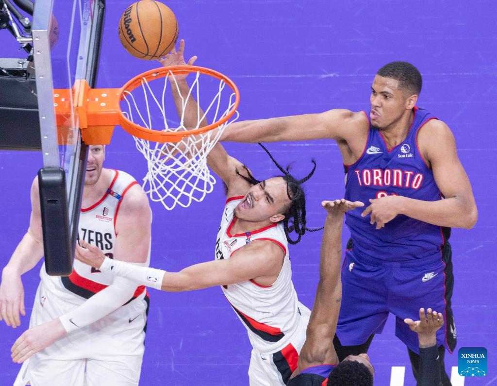 Dalano Banton (C) of Portland Trail Blazers goes up for a layup during the 2024-2025 NBA regular season game between Toronto Raptors and Portland Trail Blazers in Toronto, Canada, on April 3, 2025. (Photo by Zou Zheng/Xinhua)