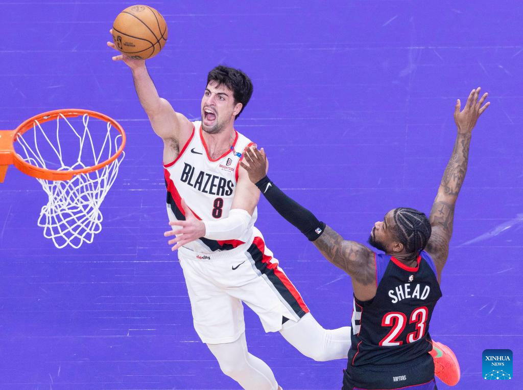 Deni Avdija (L) of Portland Trail Blazers goes for a layup during the 2024-2025 NBA regular season game between Toronto Raptors and Portland Trail Blazers in Toronto, Canada, on April 3, 2025. (Photo by Zou Zheng/Xinhua)