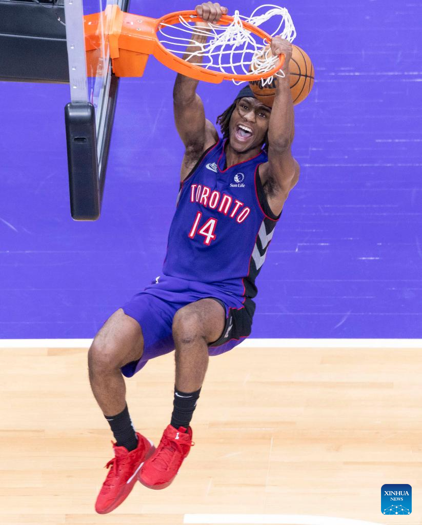 Ochai Agbaji of Toronto Raptors dunks during the 2024-2025 NBA regular season game between Toronto Raptors and Portland Trail Blazers in Toronto, Canada, on April 3, 2025. (Photo by Zou Zheng/Xinhua)