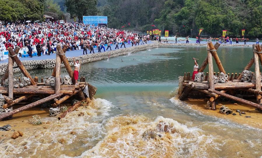 People take part in a water releasing festival held in Dujiangyan, southwest China's Sichuan Province, April 4, 2025. (Xinhua/Jiang Hongjing)