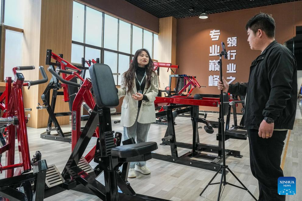 A woman sells products via livestreaming at a fitness equipment manufacturer in Ningjin County, east China's Shandong Province, April 2, 2025. Ningjin County is a major commercial fitness equipment manufacturing hub in China, serving global markets in over 170 countries and regions. The county produces more than 1,000 product variants across 400-plus categories including aerobic machines, strength training systems, and rehabilitation apparatus. With 2,509 registered enterprises (20 being large-scale manufacturers), the total output value of the fitness equipment industry in Ningjin reached 13.9 billion yuan (about 1.9 billion U.S. dollars) in 2024. (Xinhua/Zhu Zheng)