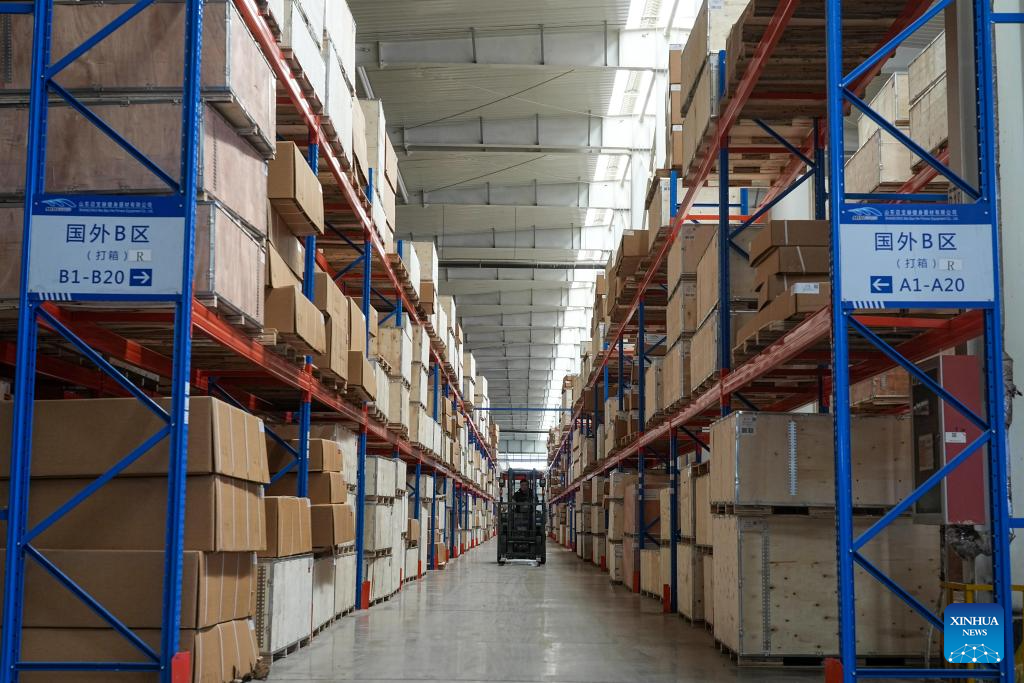A worker transports products at a fitness equipment manufacturer in Ningjin County, east China's Shandong Province, April 2, 2025. Ningjin County is a major commercial fitness equipment manufacturing hub in China, serving global markets in over 170 countries and regions. The county produces more than 1,000 product variants across 400-plus categories including aerobic machines, strength training systems, and rehabilitation apparatus. With 2,509 registered enterprises (20 being large-scale manufacturers), the total output value of the fitness equipment industry in Ningjin reached 13.9 billion yuan (about 1.9 billion U.S. dollars) in 2024. (Xinhua/Zhu Zheng)