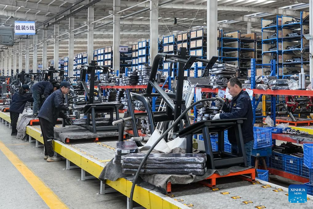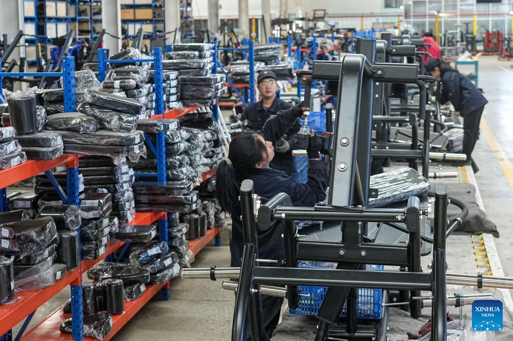 People work at a fitness equipment manufacturer in Ningjin County, east China's Shandong Province, April 2, 2025. Ningjin County is a major commercial fitness equipment manufacturing hub in China, serving global markets in over 170 countries and regions. The county produces more than 1,000 product variants across 400-plus categories including aerobic machines, strength training systems, and rehabilitation apparatus. With 2,509 registered enterprises (20 being large-scale manufacturers), the total output value of the fitness equipment industry in Ningjin reached 13.9 billion yuan (about 1.9 billion U.S. dollars) in 2024. (Xinhua/Zhu Zheng)