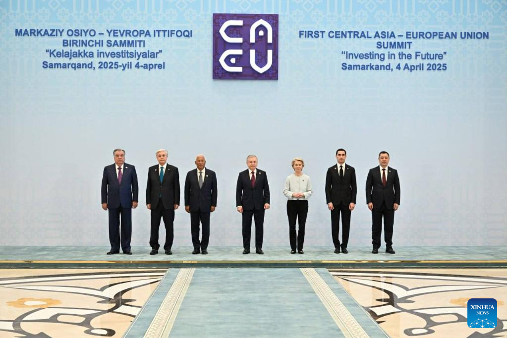 Tajik President Emomali Rahmon (1st L), Kazakh President Kassym-Jomart Tokayev (2nd L), European Council President Antonio Costa (3rd L), Uzbek President Shavkat Mirziyoyev (C), European Commission President Ursula von der Leyen (3rd R), Turkmen President Serdar Berdimuhamedov (2nd R), and Kyrgyz President Sadyr Japarov (1st R) attend the first Central Asia-EU summit in Samarkand, Uzbekistan, on April 4, 2025. The first Central Asia-EU summit, chaired by Uzbek President Shavkat Mirziyoyev, was held in the Uzbek city on Friday, according to the presidential press service. (Press Service of the Uzbek President/Handout via Xinhua)