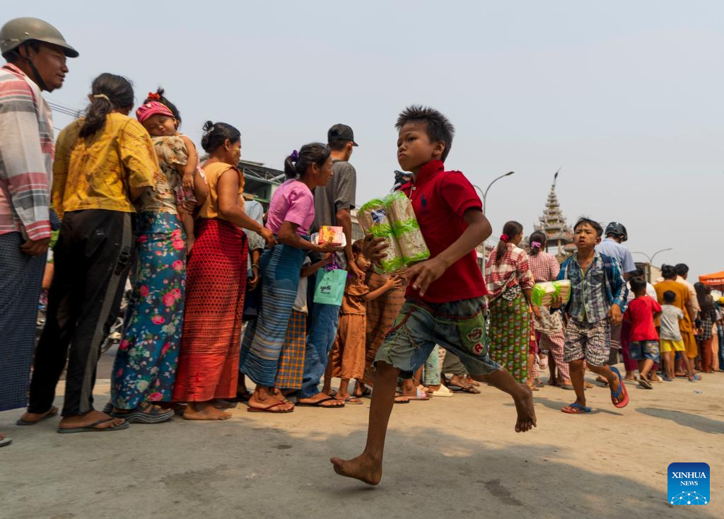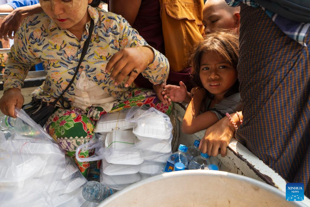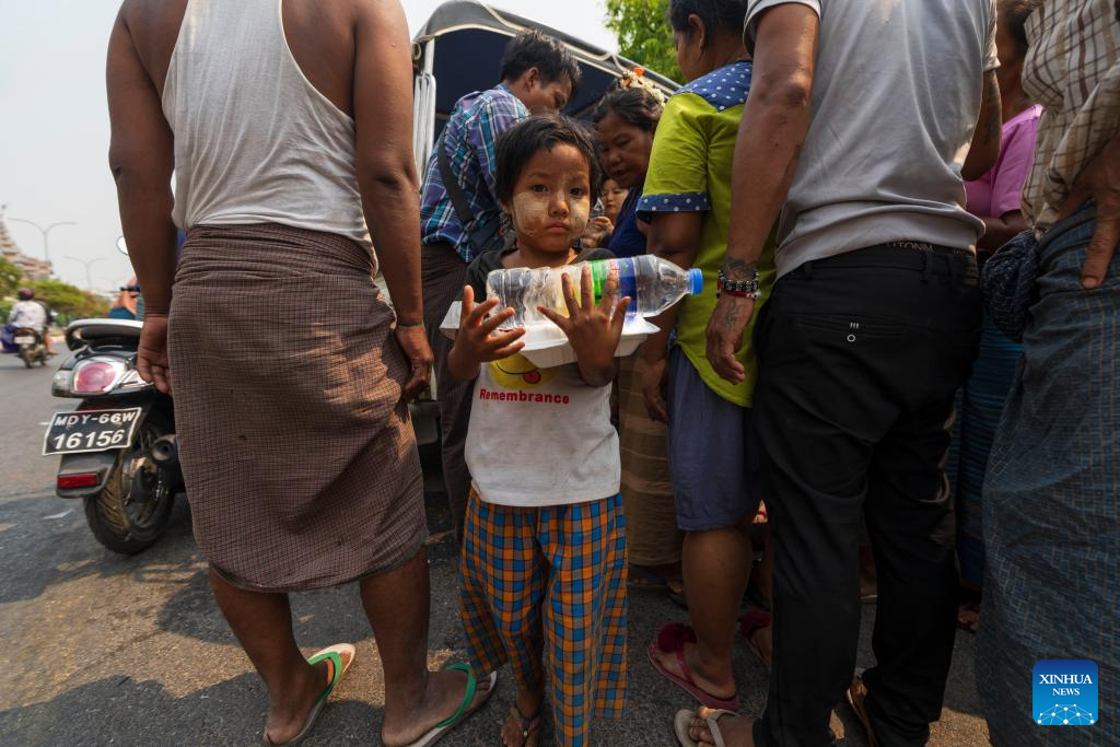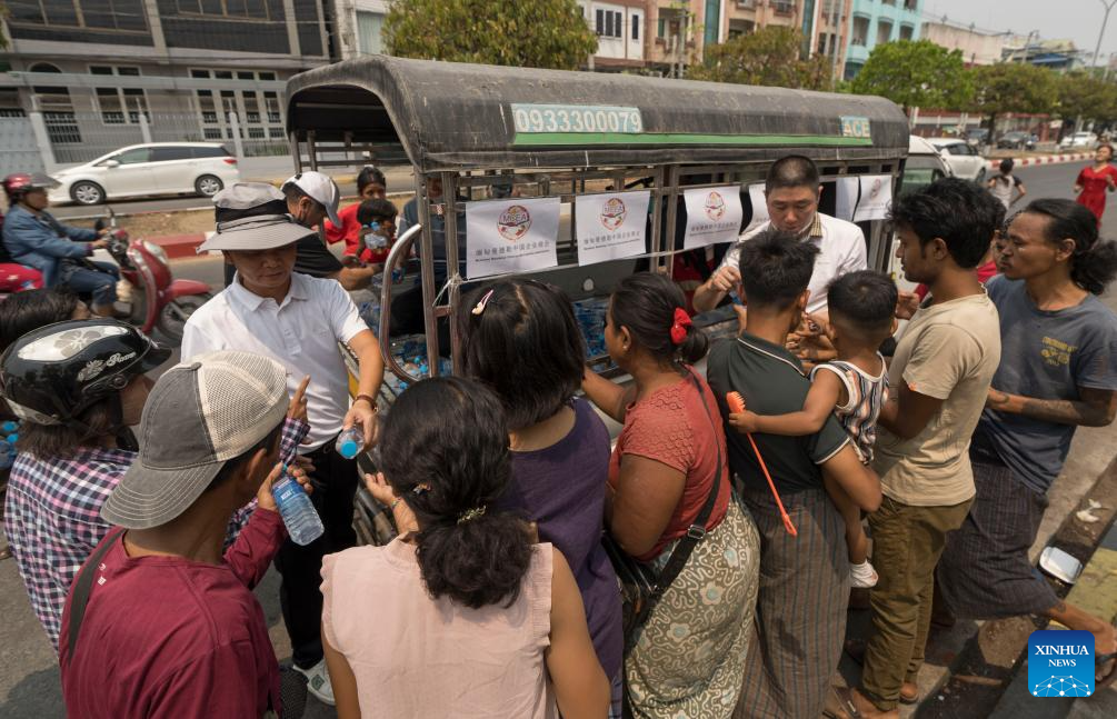 Staff members from Myanmar Mandalay Chinese Enterprises Association distribute bottles of drinking water at a temporary shelter in Mandalay, Myanmar, April 4, 2025. Myanmar's recent earthquake has caused severe casualties, with 3,301 deaths, 4,792 people injured, and 221 reported missing, according to the official media Myanmar Radio and Television on Friday. (Xinhua/Cai Yang)