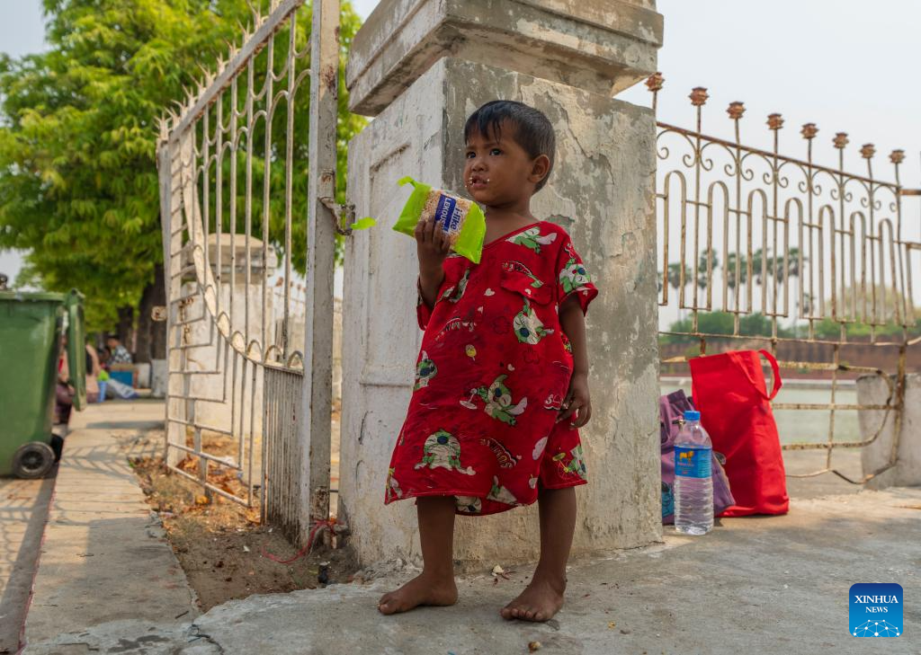 A child eats distributed food at a temporary shelter in Mandalay, Myanmar, April 4, 2025. Myanmar's recent earthquake has caused severe casualties, with 3,301 deaths, 4,792 people injured, and 221 reported missing, according to the official media Myanmar Radio and Television on Friday. (Xinhua/Cai Yang)