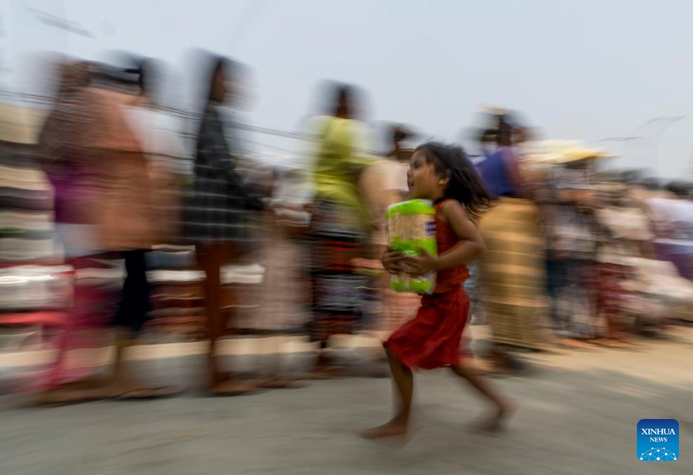 A child receives food and drinking water at a temporary shelter in Mandalay, Myanmar, April 4, 2025. Myanmar's recent earthquake has caused severe casualties, with 3,301 deaths, 4,792 people injured, and 221 reported missing, according to the official media Myanmar Radio and Television on Friday. (Xinhua/Cai Yang)