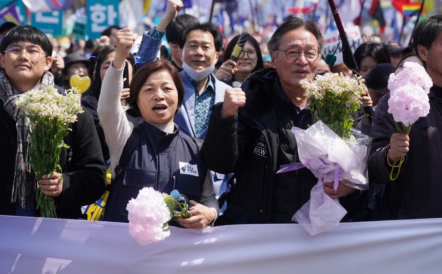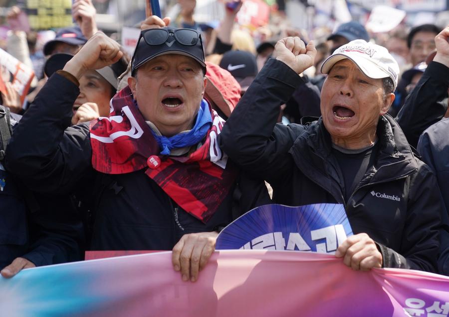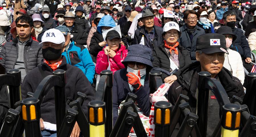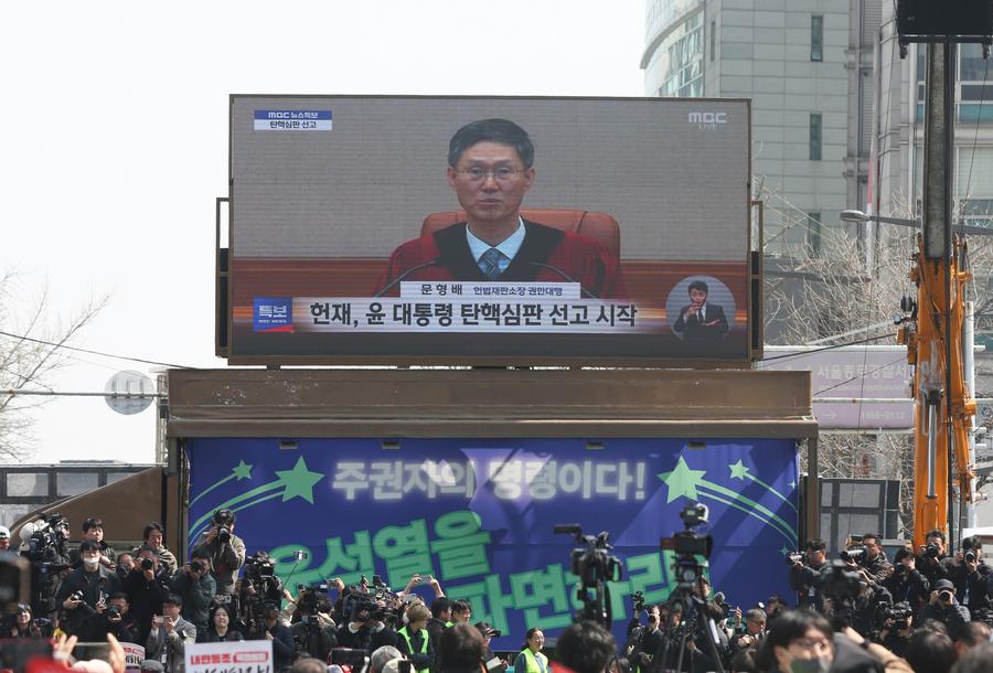 SEOUL, April 4 (Xinhua) -- The streets of central Seoul were charged with contrasting emotions as South Korea's Constitutional Court on Friday handed down its long-awaited ruling on President Yoon Suk-yeol's fate.