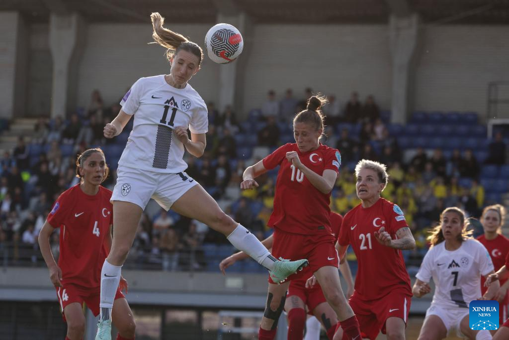 Lara Prasnikar (Top) of Slovenia vies for a header during the Group B match of UEFA Women's Nations League between Slovenia and Türkiye in Ljubljana, Slovenia, April 4, 2025. (Photo by Zeljko Stevanic/Xinhua)