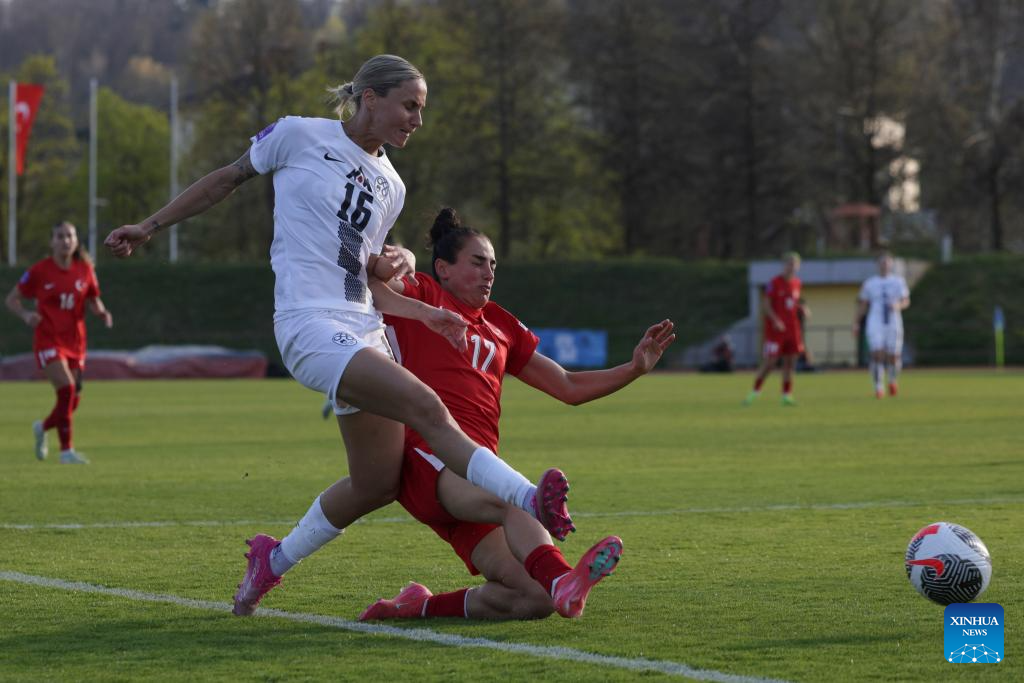 Kaja Erzen (L) of Slovenia vies with ilayda Civelek of Türkiye during the Group B match of UEFA Women's Nations League between Slovenia and Türkiye in Ljubljana, Slovenia, April 4, 2025. (Photo by Zeljko Stevanic/Xinhua)