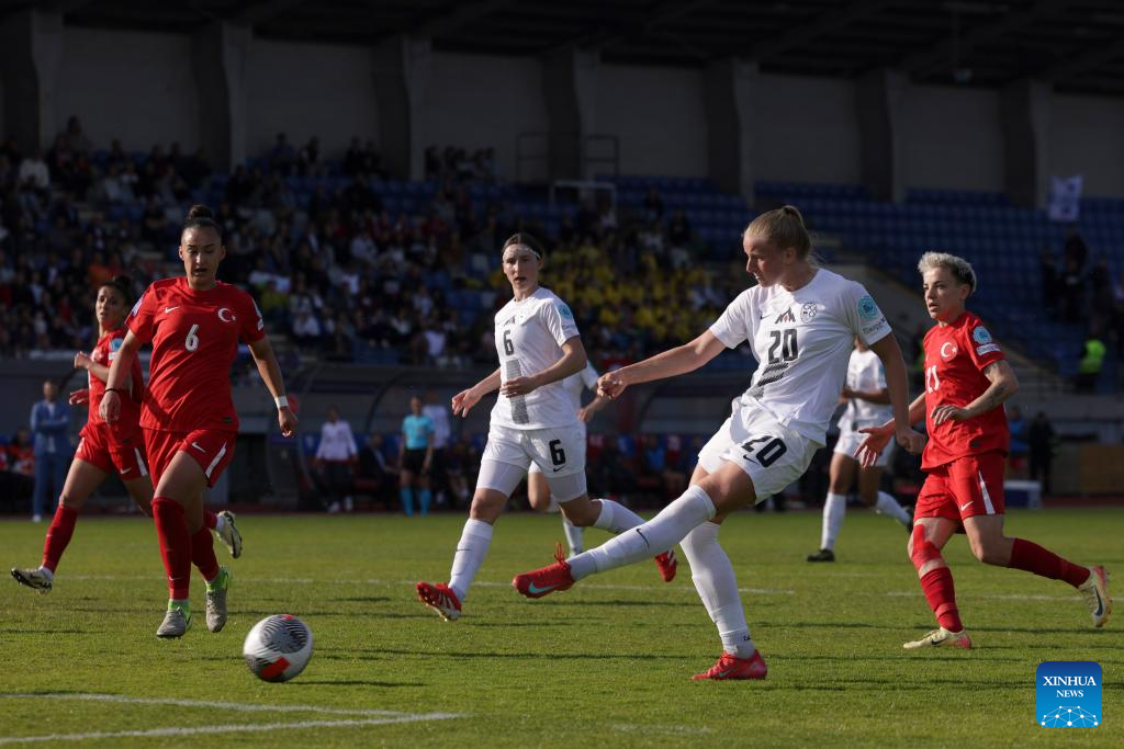 Zara Kramzar (2nd R) of Slovenia shoots to score during the Group B match of UEFA Women's Nations League between Slovenia and Türkiye in Ljubljana, Slovenia, April 4, 2025. (Photo by Zeljko Stevanic/Xinhua)