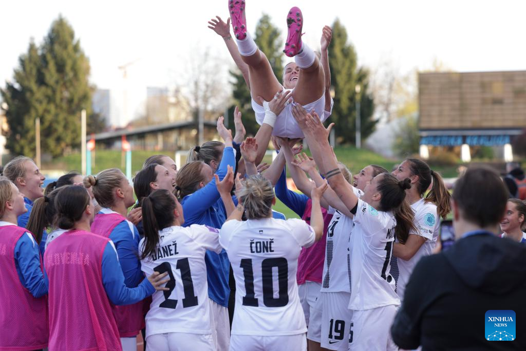 Players of Slovenia celebrate victory after the Group B match of UEFA Women's Nations League between Slovenia and Türkiye in Ljubljana, Slovenia, April 4, 2025. (Photo by Zeljko Stevanic/Xinhua)