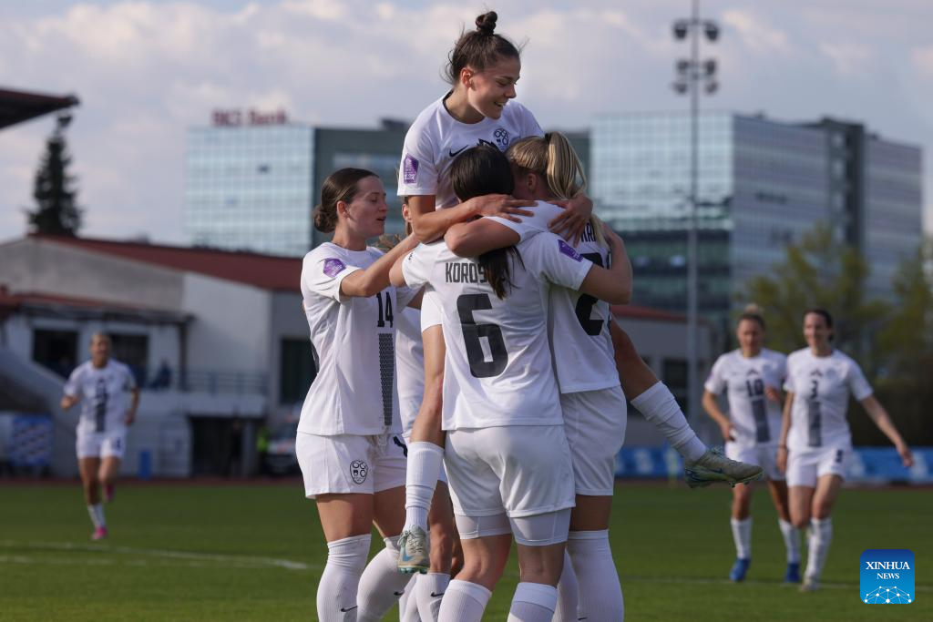 Players of Slovenia celebrate a goal during the Group B match of UEFA Women's Nations League between Slovenia and Türkiye in Ljubljana, Slovenia, April 4, 2025. (Photo by Zeljko Stevanic/Xinhua)