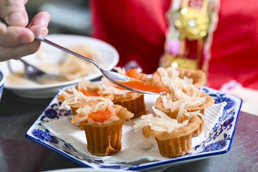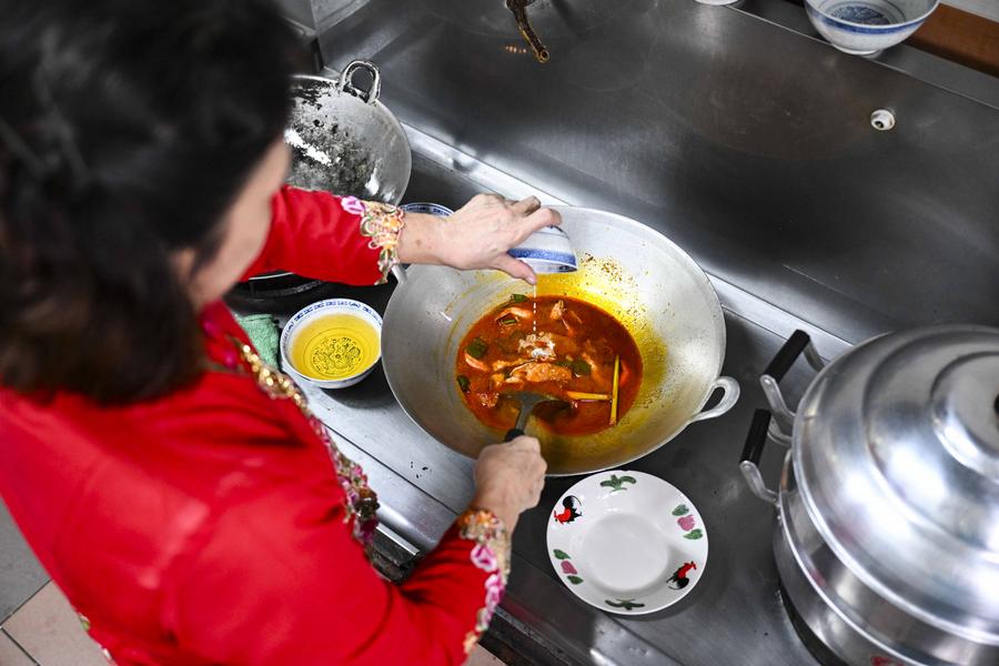The owner of a Nyonya restaurant makes a dish in Malacca, Malaysia, March 15, 2025. (Xinhua/Cheng Yiheng)