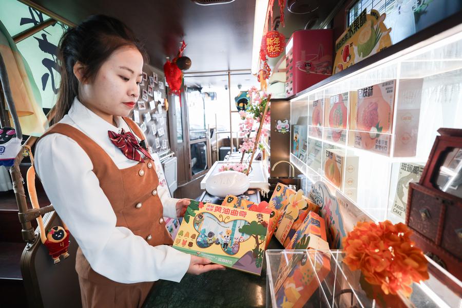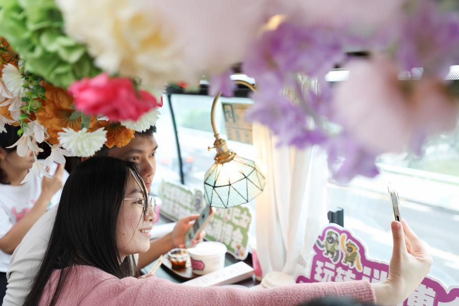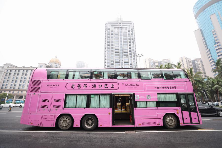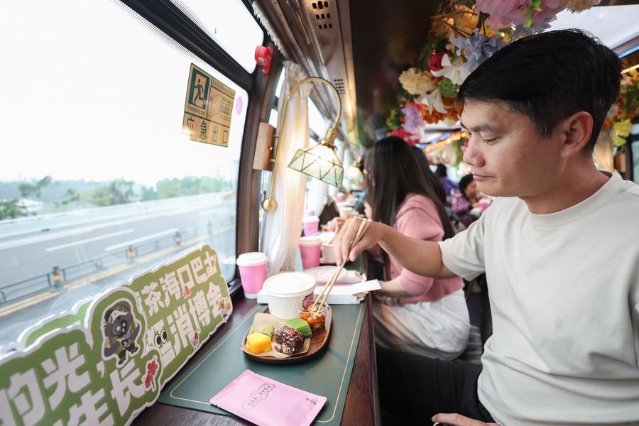 HAIKOU, April 6 (Xinhua) -- Ahead of the upcoming fifth China International Consumer Products Expo (CICPE), the Laobacha Haikou Bus has inaugurated its CICPE special route. Laobacha is a beloved Hainan tradition where locals gather over fragrant tea, savory snacks, and leisurely chat. Featuring a panoramic sunroof and a music stage, the bus blends local culture with innovative expo-themed designs and connects popular tourist spots across the city, showcasing the charm of local tourism.
