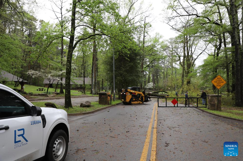 Workers try to remove trees toppled by strong winds in Boyle Park in Little Rock, Arkansas, the United States, April 6, 2025. Fierce storms have battered vast swathes of the U.S. Midwest and South for four days, unleashing hundreds of tornadoes, heavy rains and historic flooding that had claimed at least 16 lives as of Saturday night. (Photo by Yan Sun/Xinhua)