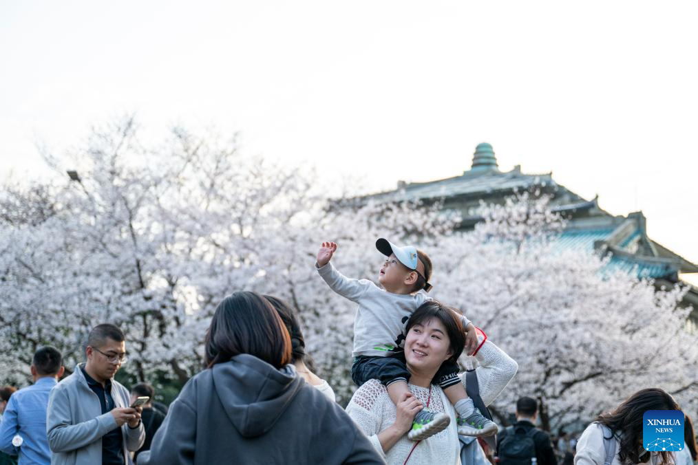People enjoy cherry blossoms at Wuhan University in Wuhan, capital of central China's Hubei Province, March 22, 2025. (Xinhua/Wu Zhizun)