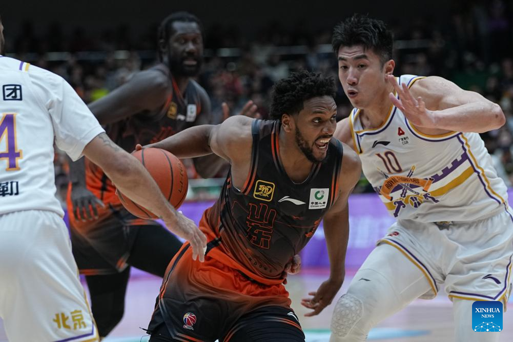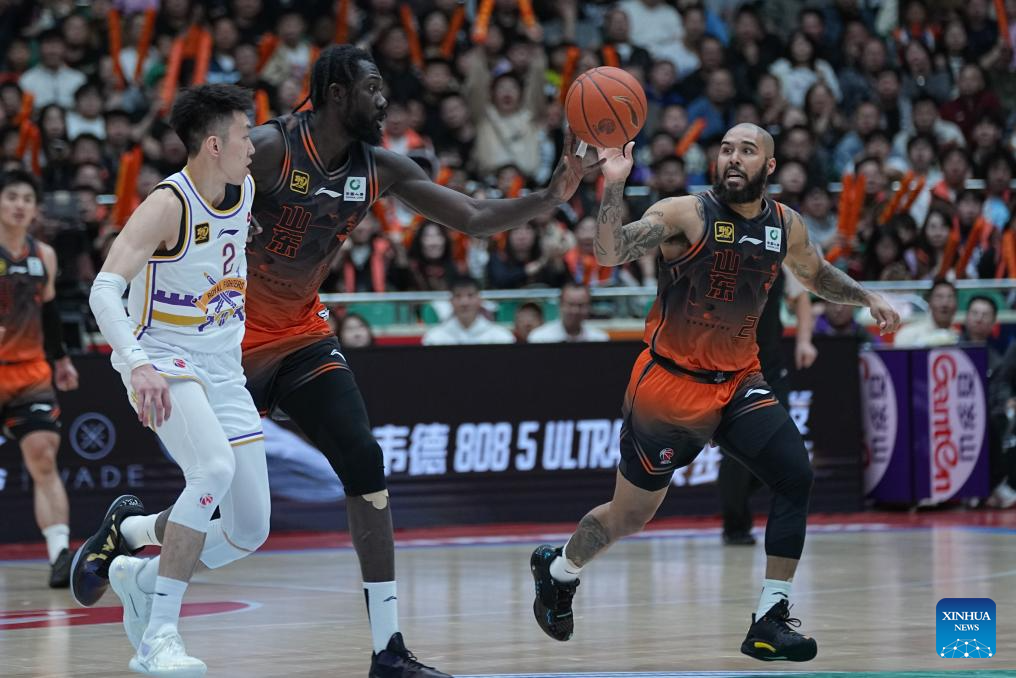 Jarmar Gulley (C) of Shandong Heroes breaks through during the playoff 1st round match between Shandong Heroes and Beijing Royal Fighters at the 2024-2025 season of the Chinese Basketball Association (CBA) league in Jinan, east China's Shandong Province, April 5, 2025. (Xinhua/Zhu Zheng)