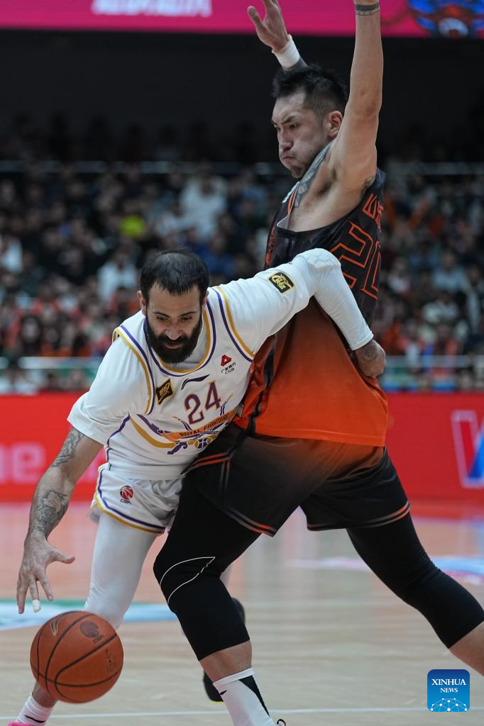 Grant Riller (L) of Beijing Royal Fighters breaks through during the playoff 1st round match between Shandong Heroes and Beijing Royal Fighters at the 2024-2025 season of the Chinese Basketball Association (CBA) league in Jinan, east China's Shandong Province, April 5, 2025. (Xinhua/Zhu Zheng)