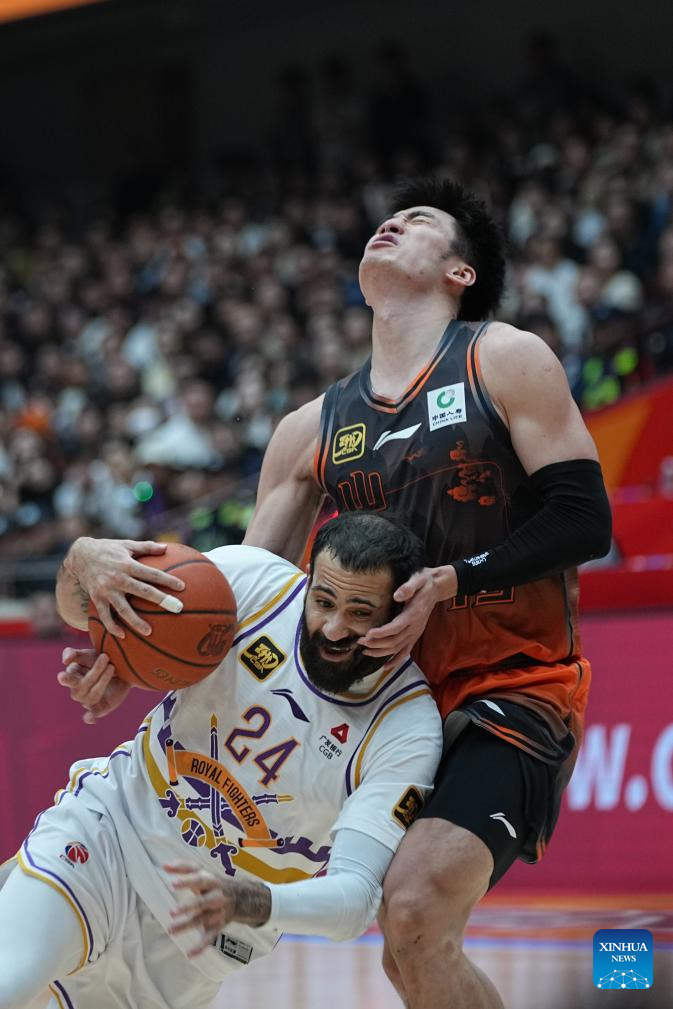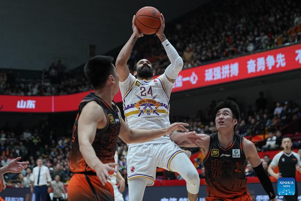 Grant Riller (C) of Beijing Royal Fighters shoots during the playoff 1st round match between Shandong Heroes and Beijing Royal Fighters at the 2024-2025 season of the Chinese Basketball Association (CBA) league in Jinan, east China's Shandong Province, April 5, 2025. (Xinhua/Zhu Zheng)