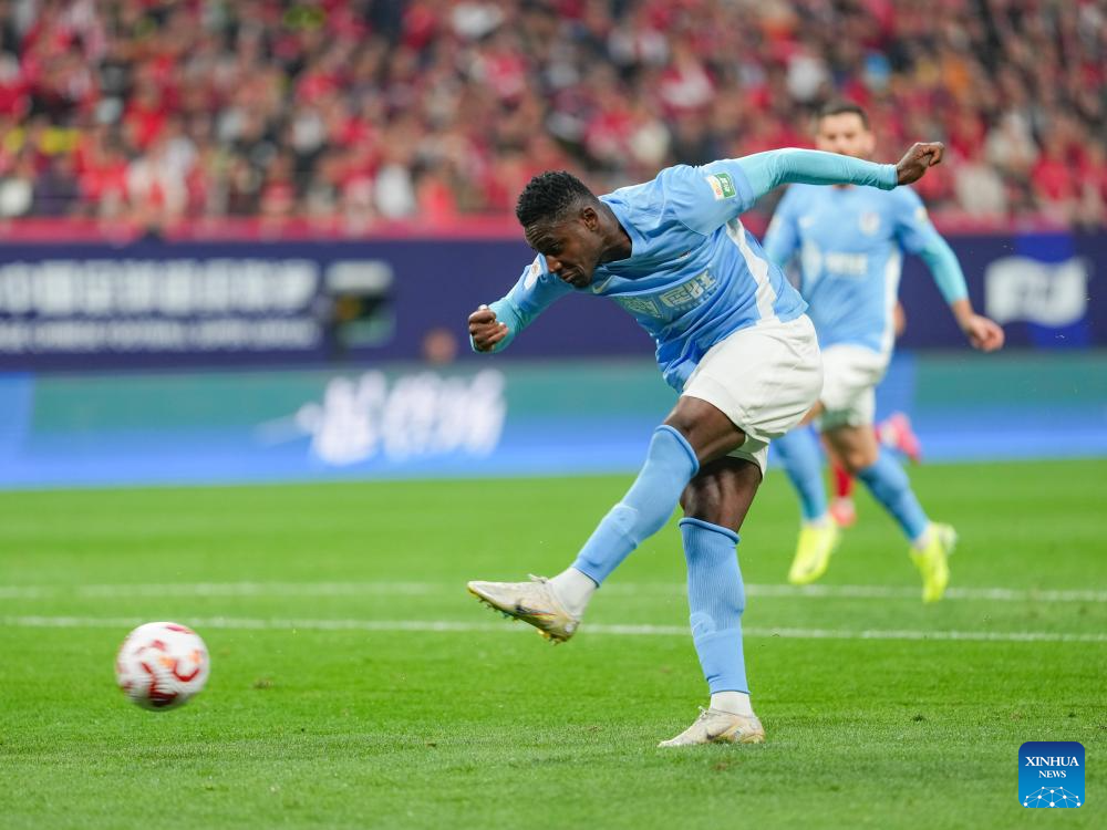 Cephas Malele of Dalian Yingbo shoots during the 5th round match between Chengdu Rongcheng and Dalian Yingbo at the 2025 season Chinese Football Super League (CSL) in Chengdu, southwest China's Sichuan Province, April 6, 2025. (Xinhua/Wang Xi)