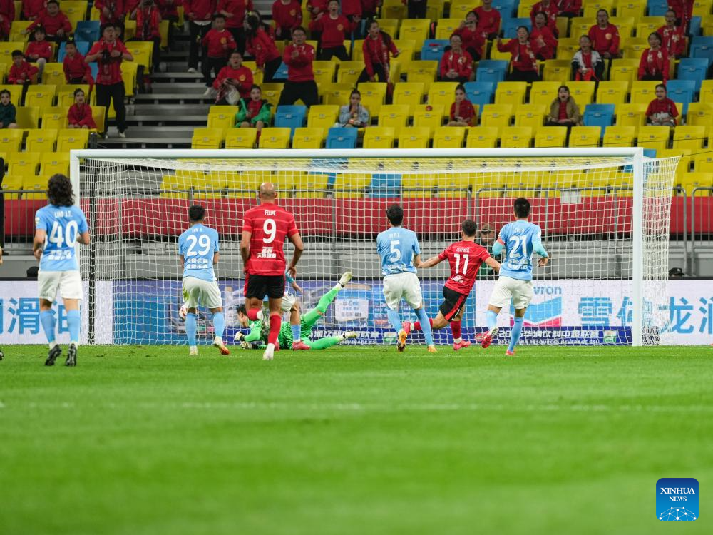 Yahav Gurfinkel (2nd R) of Chengdu Rongcheng scores during the 5th round match between Chengdu Rongcheng and Dalian Yingbo at the 2025 season Chinese Football Super League (CSL) in Chengdu, southwest China's Sichuan Province, April 6, 2025. (Xinhua/Wang Xi)