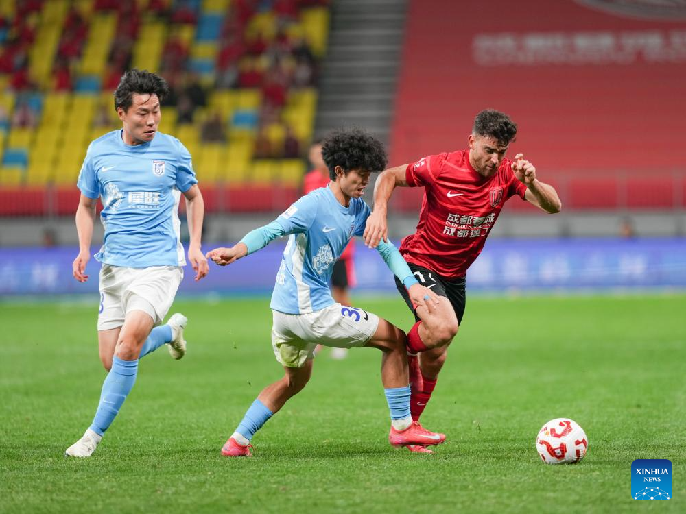 Yahav Gurfinkel (R) of Chengdu Rongcheng vies with Lyu Zhuoyi (C) of Dalian Yingbo during the 5th round match between Chengdu Rongcheng and Dalian Yingbo at the 2025 season Chinese Football Super League (CSL) in Chengdu, southwest China's Sichuan Province, April 6, 2025. (Xinhua/Wang Xi)