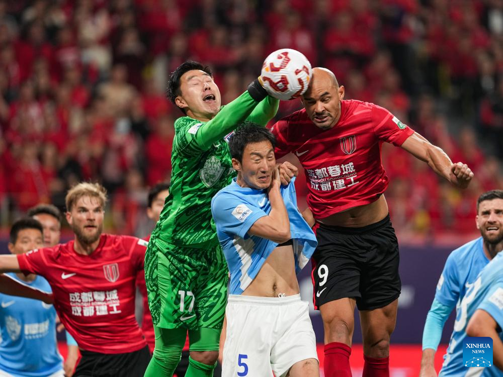 Felipe Silva (up R) of Chengdu Rongcheng vies with goalkeeper Sui Weijie (up L) of Dalian Yingbo during the 5th round match between Chengdu Rongcheng and Dalian Yingbo at the 2025 season Chinese Football Super League (CSL) in Chengdu, southwest China's Sichuan Province, April 6, 2025. (Xinhua/Wang Xi)