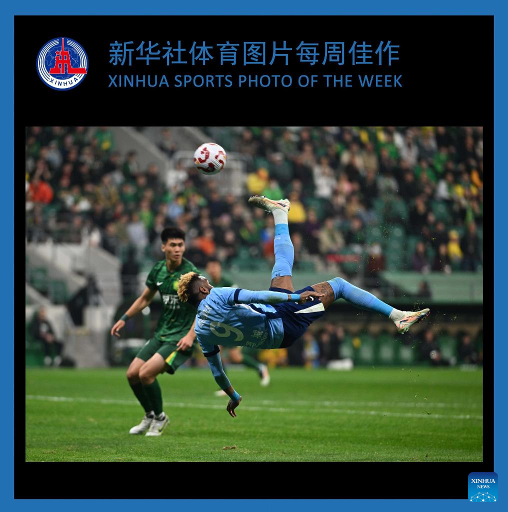 XINHUA SPORTS PHOTO OF THE WEEK (from March 31 to April 6, 2025) TRANSMITTED on April 7, 2025. Aaron Boupendza (front) of Zhejiang Greentown takes a bicycle kick during the 5th round match between Beijing Guoan and Zhejiang Greentown at the 2025 season Chinese Football Super League (CSL) in Beijing, China, April 6, 2025. (Xinhua/Li Ga)