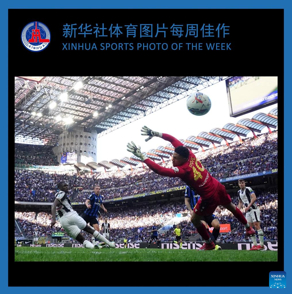 XINHUA SPORTS PHOTO OF THE WEEK (from March 31 to April 6, 2025) TRANSMITTED on April 7, 2025. Udinese's Maduka Okoye (Front) fails to save the goal of Inter Milan's Davide Frattesi (2nd L) during a Serie A football match between Inter Milan and Udinese in Milan, Italy, March 30, 2025. (Photo by Alberto Lingria/Xinhua)
