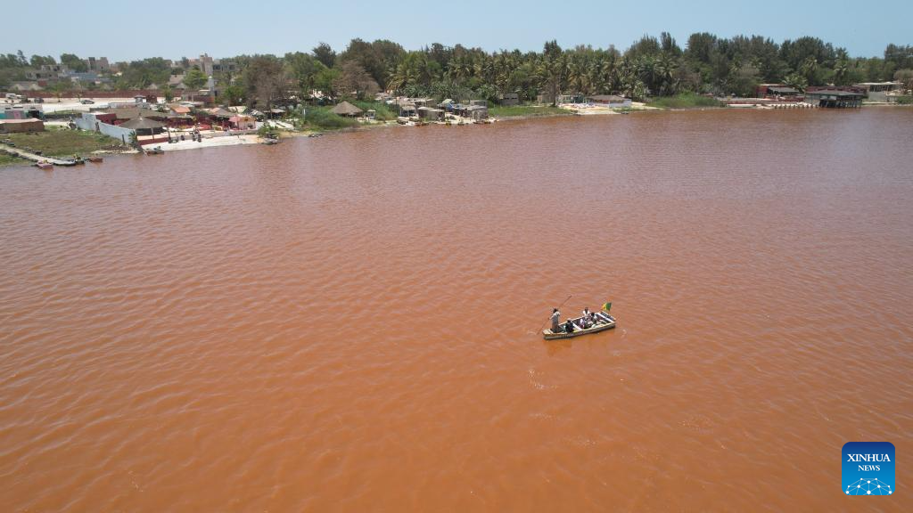Tourists ride a sightseeing boat at the Lake Retba, also known as the Lac Rose, near Dakar, Senegal, April 6, 2025. (Xinhua/Si Yuan)