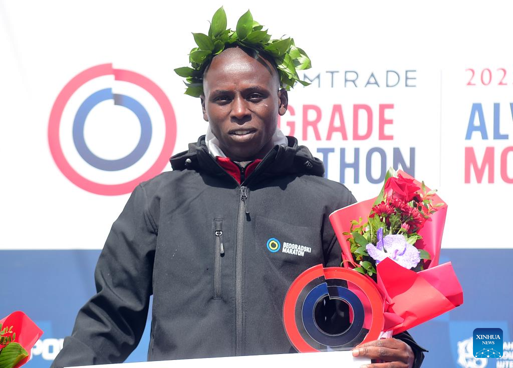 Gold medalist Gilbert Kipleting Chumba of Kenya poses for photos during the awarding ceremony for the men's category at the 38th Belgrade marathon in Belgrade, Serbia, on April 6, 2025. (Photo by Predrag Milosavljevic/Xinhua)