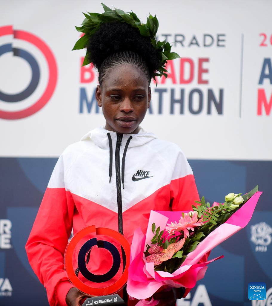 Gold medalist Emmah Cheruto Ndiwa of Kenya poses for photos during the awarding ceremony for the women's category at the 38th Belgrade marathon in Belgrade, Serbia, on April 6, 2025. (Photo by Predrag Milosavljevic/Xinhua)