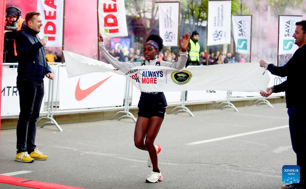 Kenya's Emmah Cheruto Ndiwa (C) celebrates as she crosses the finish line to win the women's category of the 38th Belgrade marathon in Belgrade, Serbia, on April 6, 2025. (Photo by Predrag Milosavljevic/Xinhua)