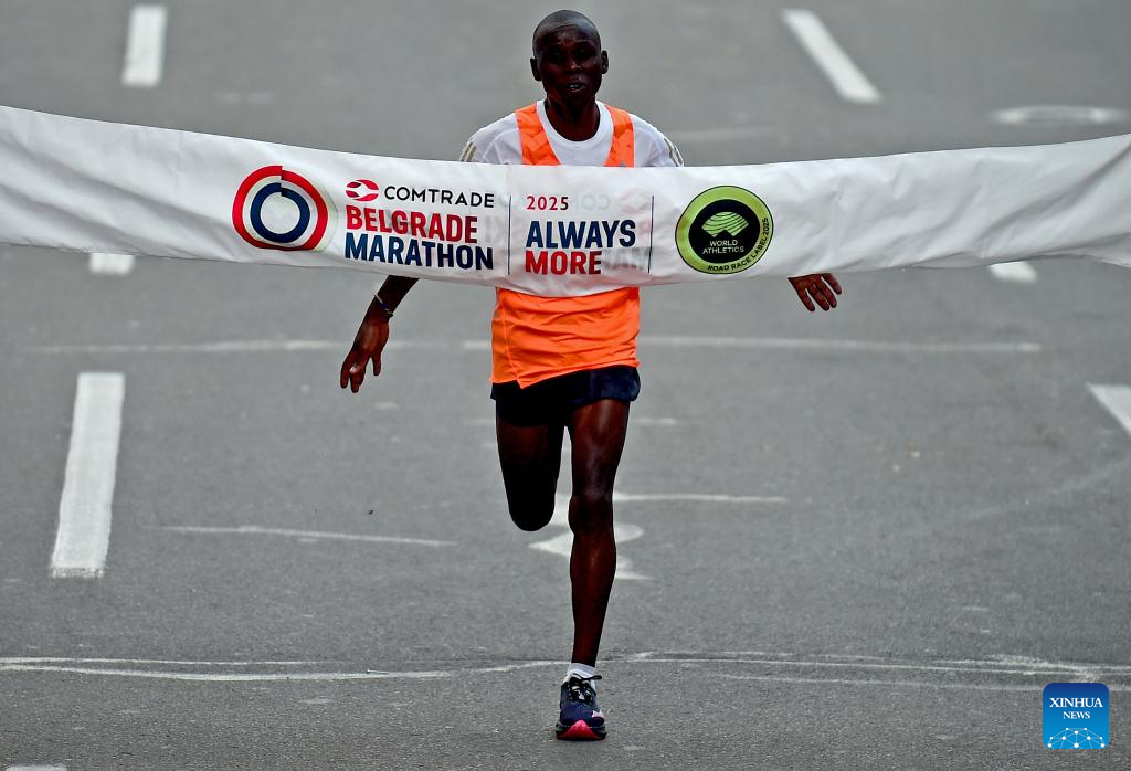 Kenya's Gilbert Kipleting Chumba crosses the finish line to win the men's category of the 38th Belgrade marathon in Belgrade, Serbia, on April 6, 2025. (Photo by Predrag Milosavljevic/Xinhua)