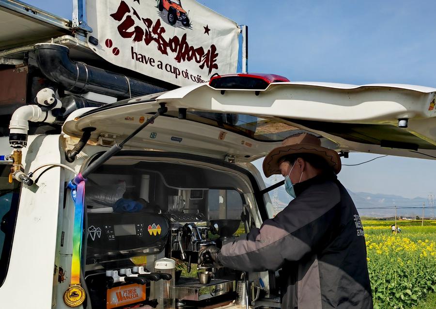 XI'AN, April 8 (Xinhua) -- Amid a golden sea of canola flowers in the countryside, a caravan can be seen parked on the road, while a fusion of the aromas of coffee and flowers drifts in the air, attracting tourists and perhaps a few bees and butterflies from far and wide.