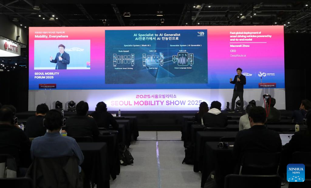Maxwell Zhou, CEO of DeepRoute.ai, a Chinese company specialized in smart driving technologies, makes a presentation during the Seoul Mobility Show 2025 in Goyang City, Gyeonggi Province of South Korea, on April 8, 2025. The Seoul Mobility Show 2025 is held here from April 4 to 13. (Xinhua/Yao Qilin)