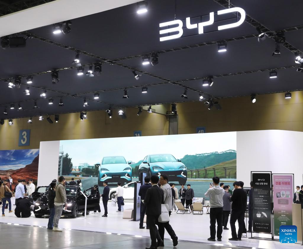 Visitors watch the vehicles at Chinese electric vehicle manufacturer BYD's booth during the Seoul Mobility Show 2025 in Goyang City, Gyeonggi Province of South Korea, on April 8, 2025. The Seoul Mobility Show 2025 is held here from April 4 to 13. (Xinhua/Yao Qilin)