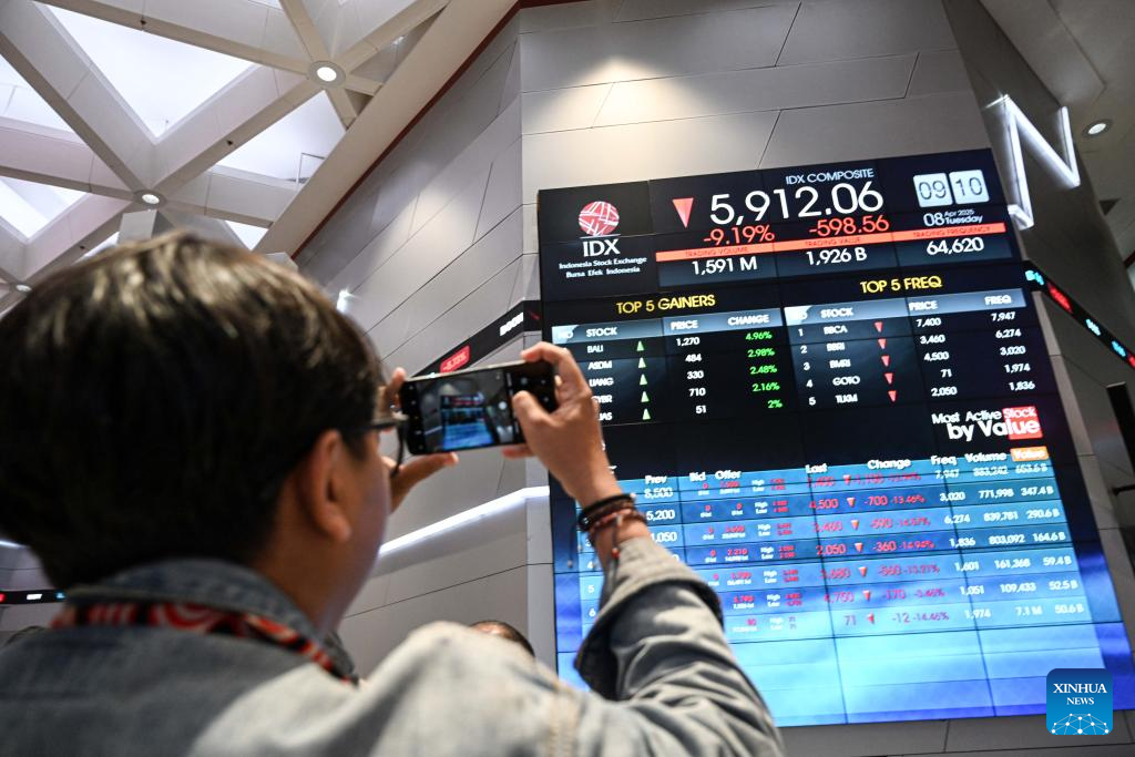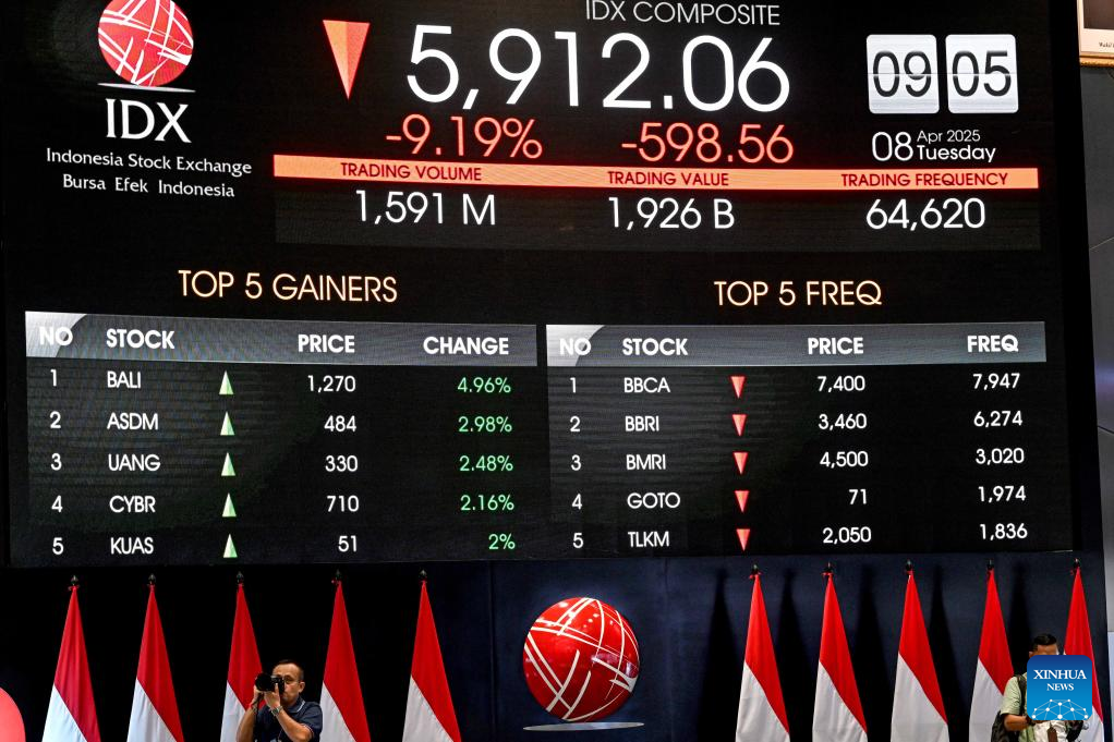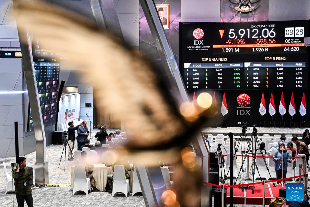 A display panel showing the Composite Stock Price Index is pictured at the Indonesia Stock Exchange building in Jakarta, Indonesia, April 8, 2025. Indonesia's stock market temporarily halted trading for 30 minutes on Tuesday morning after the main index plunged 9.19 percent at the opening, following a long holiday for the Eid al-Fitr festival.(Xinhua/Agung Kuncahya B.)