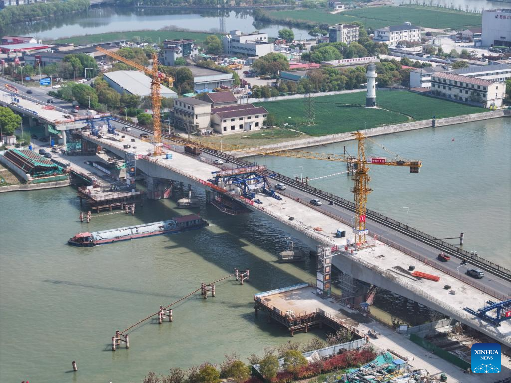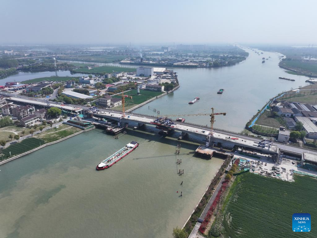 An aerial drone photo taken on April 8, 2025 shows vessels passing under the Pingwang Bridge in Suzhou, east China's Jiangsu Province. The Pingwang Bridge, a project of the east part of the Chang-Hu-Shen (Changxin-Huzhou-Shanghai) navigation channel (Jiangsu section) improvement project, is under construction. (Xinhua/Ji Chunpeng)