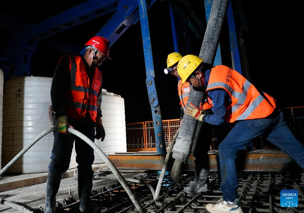 Staff members work at the construction site of the Pingwang Bridge in Suzhou, east China's Jiangsu Province, April 8, 2025. The Pingwang Bridge, a project of the east part of the Chang-Hu-Shen (Changxin-Huzhou-Shanghai) navigation channel (Jiangsu section) improvement project, is under construction. (Xinhua/Ji Chunpeng)